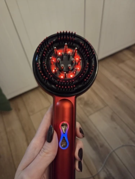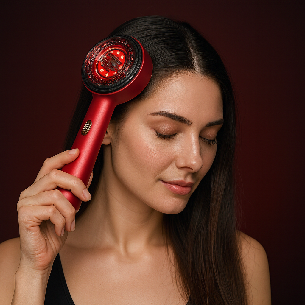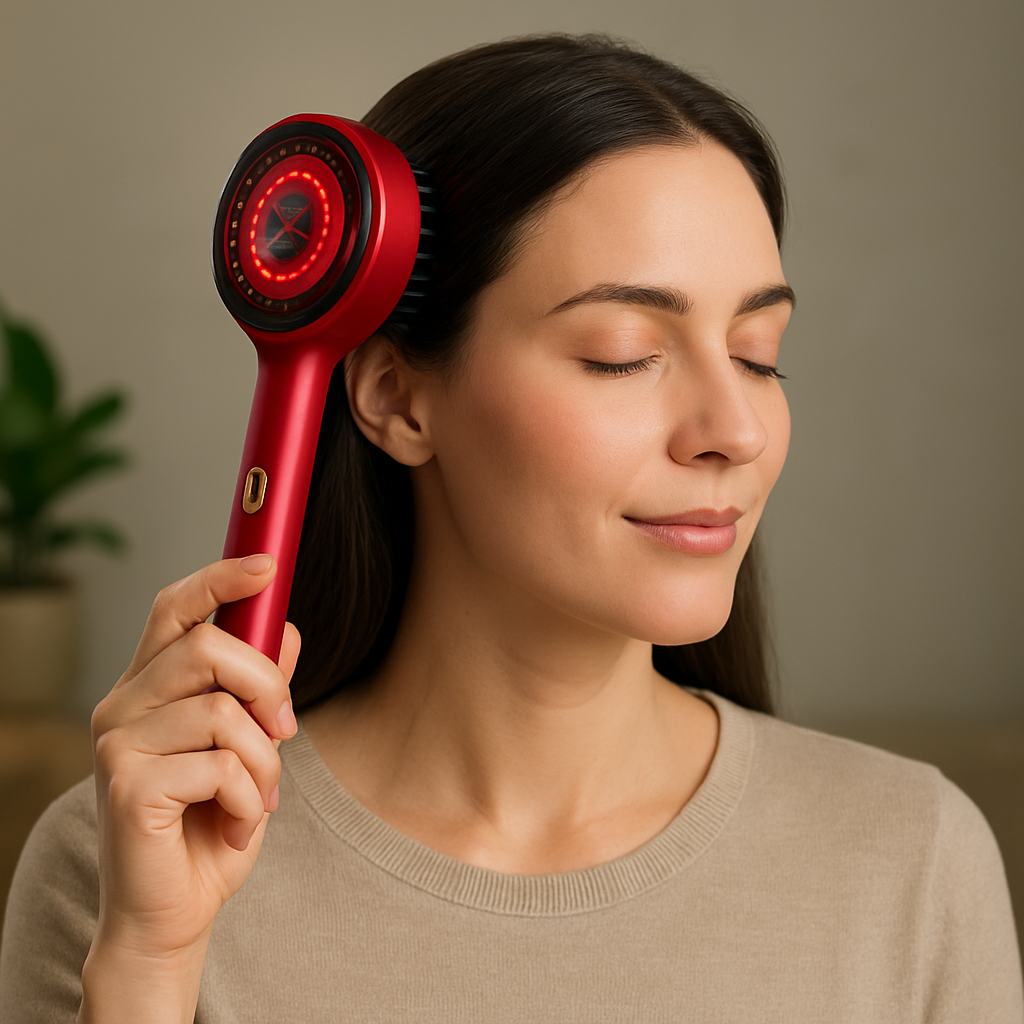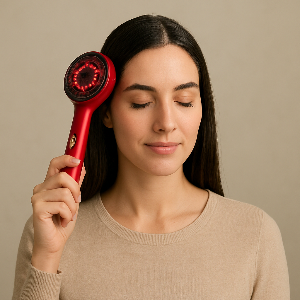 La combinación de masaje vibratorio y luz roja estimula los folículos, mejora la circulación y fortalece el cabello desde la raíz.